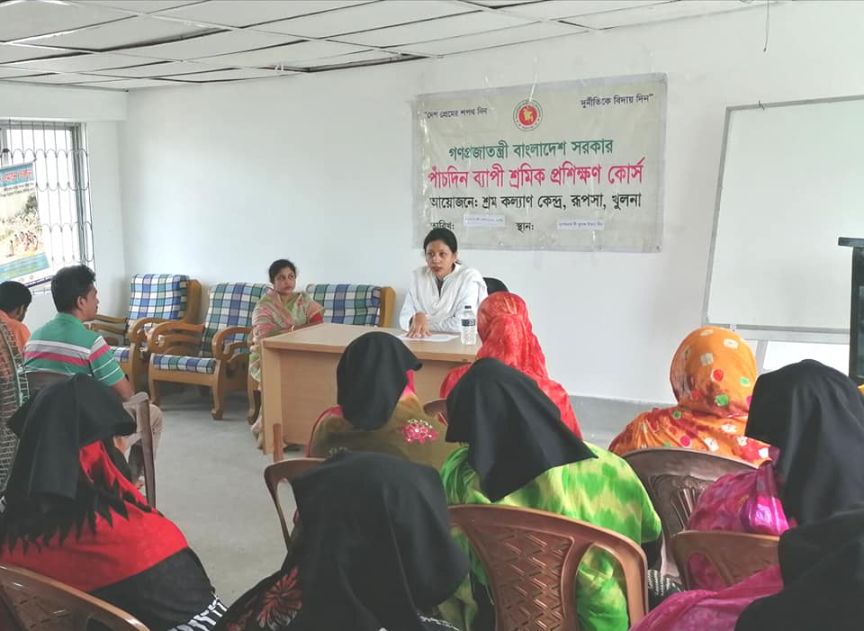 শ্রম কল্যাণ কেন্দ্র, রূপসা, খুলানা হতে ০৫ (পাঁচ) দিনব্যাপী শ্রমিক শিক্ষা প্রশিক্ষণ কোর্সে ৩৫ (পঁয়ত্রিশ) জনকে প্রশিক্ষণ দেওয়া হয়। প্রশিক্ষণের জন্য কারখানা/প্রতিষ্ঠানের বরাবর ৩৫ জন প্রশিক্ষণার্থীর মনোনয়ন চেয়ে পত্র প্রেরণ করা হয়। পত্রের ভিত্তিতে কারখানা/প্রতিষ্ঠান কর্তৃপক্ষ ৩৫ জন শ্রমিক –কর্মচারীদের মনোনেয়নের তালিকা প্রেরণ করেন। মনোনয়নপত্র প্রপ্তির সাপেক্ষ্যে অন্যান্য কাগজপত্র সংযুক্ত করে প্রশিক্ষণের ১৫ দিন পূর্বে মহাপরিচালক মহোদয়কে অবহিত করণের জন্য পত্র প্রেরণ করা হয়। নির্ধারিত দিনে কারখানার মনোনীত প্রশিক্ষণার্থীদের নিয়ে সকাল ৯:০০ ঘটিকা হতে বিকাল ৫:০০ ঘটিকা পযন্ত প্রশিক্ষণ প্রদান করা হয়। প্রশিক্ষণে শ্রম অধিদপ্তরের ১ম শ্রেণির কর্মকর্তাবৃন্দ ও অন্যান্য আমন্ত্রিত অতিথি বক্তারা শ্রম আইন ২০০৬, স্বাস্থ্য সেবা, পেশাগত স্বাস্থ্য ও নিরাপত্তা,অটিজমসহ বিভিন্ন বিষয়ে আলোচনা করেন। মোট ২০ টি ক্লাসের ১৭ টিতে আমন্ত্রিত বক্তারা বক্তব্য প্রদান করেন। অত্র কেন্দ্রের মেডিকেল অফিসার বাকী ০৩ টি ক্লাসের বক্তব্য প্রদান করেন । প্রতিদিনের হাজিরা শীটে নেওয়া স্বাক্ষরের ভিত্তিতে প্রশিক্ষণার্থীদের ১৫০ টাকা হারে সম্মানী ভাতা প্রদান করা হয়। প্রশিক্ষণ শেষে প্রশিক্ষণার্থীদের মাঝে কোর্স সমন্বয়কারী ও মহাপরিচালক, শ্রম অধিদপ্তর এর স্বাক্ষরিত সনদপত্র বিতরণ করা হয়।